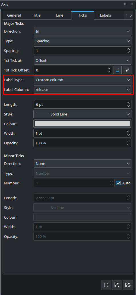 The data is properly plotted now and we only need to show a tick on the axis for every single value and to the text data in the axis labels. For this, select the x-axis and navigate in the Properties Explorer to the tab “Ticks”. Specify the spacing 1 for axis ticks and use “Custom Column” for the label type and specify the column “release” from the spreadsheet as the label column:
