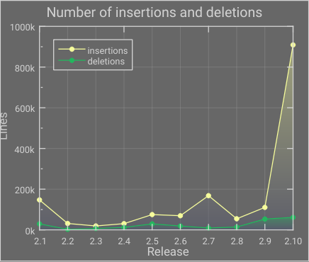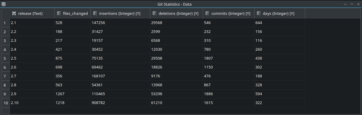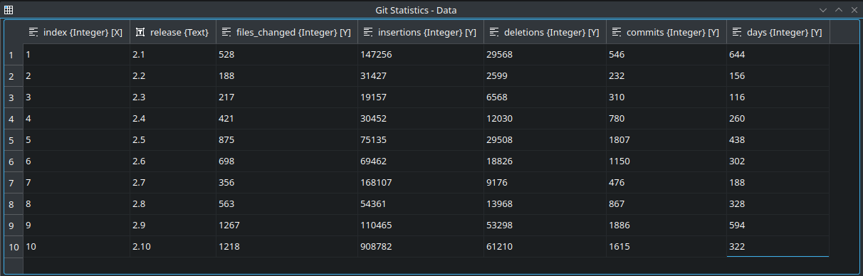 This example and the data is taken from the example project “SLOC History” that can be found in the collection of example projects that are part of LabPlot’s installation. More background for the data visualized in that example project can be found in the blog post.